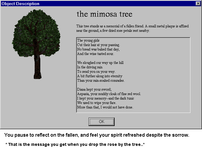 | Sharon was known to us in many different names, but she was last known as Mimosa in the land of Meridian59. She took great pleasure in "bug smashing" and when she felt something was wrong, you best believe she told you about it, particularly when it was one of "her games". Meridian59 bestowed Mimosa with this gift, The Mimosa Tree upon her passing this year .... The poem was written by Dianne Gillard, who is known as phxhawk on Server 100. |